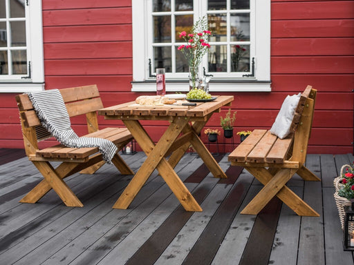 EAN 8057457155762Realizzata in pino impregnato in autoclave color marroneTavole spessore mm 42Dimensione taovlo cm 149x75x74hDimensione panche cm 1...