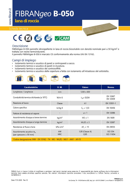 FIBRANgeo B-040Descrizione prodottoPannello idrorepellente in lana di roccia biosolubile, marcato CE conformemente alla norma UNI EN 13162. Campo d...