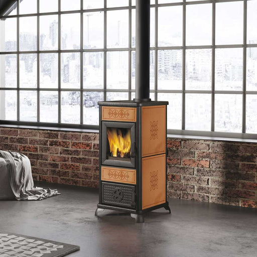 Description Compact wood-burning stove, rustic style with decorated ceramic sides and inserts, cast iron door and feet. The front and top are ...